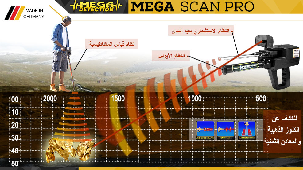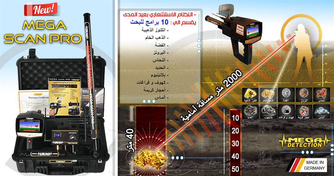 نظام احترافي دقيق ليس له مثيل عالميا تنفرد بهذه التكنولوجيا مصانع MEGA الالمانيه الشهيره تم تزويد الجهاز ب5 انظمة بحث بعيدة المدى وبنظام الماغنتوميتر الراداري الدقيق للكشف لـ 40 متر في باطن الارض
